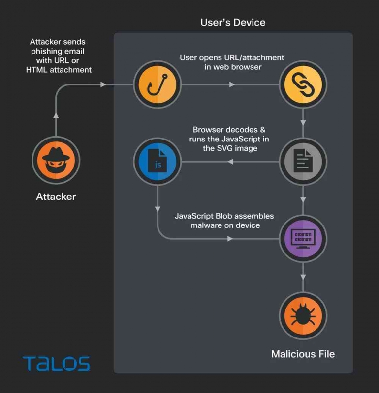 Para peneliti di Talos telah menemukan phishing yang mendistribusikan malware QBot menggunakan teknik yang memanfaatkan gambar Scalable Vector Graphics (SVG) yang disematkan dalam lampiran email HTML. HTML Smuggle seperti yang diketahui, adalah teknik yang sangat baik untuk pengiriman malware yang memanfaatkan fitur HTML5 dan JavaScript. Muatan berbahaya dikirimkan melalui string yang disandikan dalam lampiran HTML atau halaman web, dan kode HTML berbahaya dibuat di dalam browser pada perangkat target yang sudah berada di dalam perimeter keamanan jaringan korban.